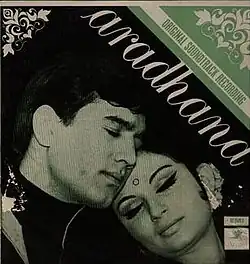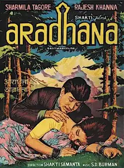 Aradhana (transl. Worship) is a 1969 Indian Hindi musical romantic drama film directed by Shakti Samanta, starring Sharmila Tagore and Rajesh Khanna. It won the Filmfare Award for Best Film at the 17th Filmfare Awards. Tagore gave one of the best performances of her career and won Filmfare Best Actress Award.[1] Originally released in Hindi[2] and dubbed in Bengali, Aradhana's huge success led to two remakes: the Tamil film Sivagamiyin Selvan (1974)[3] and the Telugu film Kannavari Kalalu (1974).[4] This film is counted among the 17 consecutive hit films of Rajesh Khanna between 1969 and 1971, by adding the two hero films Marayada and Andaz to the 15 consecutive solo hits he gave from 1969 to 1971.[5] Aradhana was a blockbuster in India and the Soviet Union.[6] The theme of the movie was based on the 1946 film To Each His Own.[7] Its run time is 169 minutes.