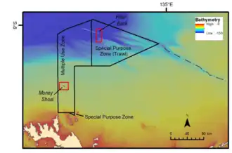 The park is managed as an IUCN category VI park[1] with three zones (see figure 1): a multiple use zone, a special purpose zone and a special purpose (trawl) zone.[3] Important sections of the park (see figure 2) include the Money Shoal, which is an area of raised sea-bed, thought to have been produced by periods of coral reef growth during the Quaternary and differing sea levels.[2]