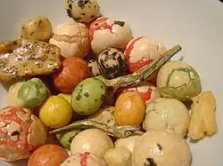There are many different sizes, colors, and shapes of arare. Some are sweet, and others savory. One, called norimaki arare (nori meaning an edible seaweed in the form of a dried sheet; maki meaning roll shape) is wrapped with dried nori seaweed. Another, kaki no tane (柿の種), takes its name from its resemblance to a persimmon seed. (Kaki is Japanese for "persimmon".) Kaki no tane are often sold with peanuts, a combination called kakipī (かきピー).[1] These are a popular snack to accompany Japanese beer.