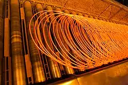 Before the onset of the Second World War, the plant operated with three blast furnaces (of 3,160 m3) and two open hearth furnaces, along with a heat and power plant. In 1941, a blooming mill with a yearly capacity of 1.7 million tonnes, a fourth blast furnace and a third open hearth furnace came online, shortly before the Nazi occupation.[5] Before German troops arrived, equipment and employees were evacuated to Nizhny Tagil, east of the Ural Mountains.[5] During the German occupation from 14 August 1941 to 22 February 1944,[1] what remained of the plant was left in ruins.[6]