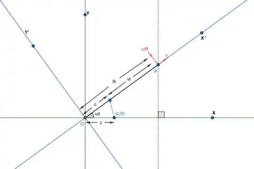 Suppose a point object moves in the Cartesian system with a constant velocity v directed parallel to the x-axis, with respect to the xy-plane. Let at time t = 0, the object was at an arbitrary point (c, 0, 0). If the xy plane rotates with a constant angular velocity ω about the z-axis, then the velocity of the point with respect to z-axis may be written as: