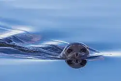 Ringed seals eat a wide variety of small prey that span several trophic levels. Scientists have some disagreement over their exact diet. Analysis reveals their diet varies depending on a variety of factors, such as location, season, life stage, and sex.[6] Research suggests a latitudinal gradient as well. Arctic cod is most often reported as the primary prey species.[2] Herring, redfish, snailfish, sand lance, and Atlantic salmon are also common prey items. Mating and molting occur in the spring, during which shrimp and invertebrates become more important to the diet. During summer and fall, seals feed on prey such as sand lance during the open water season, to prepare fat reserves for the winter. In the fall, prey from the cod family tend to make a higher percentage of the seal’s diet from late fall through spring. If females don't get adequate blubber reserves from feeding, they will suppress ovulation for that year.[2] This ensures they always have enough energy reserves needed for reproduction. Feeding is usually a solitary behavior, during which they may dive to depths of 35 to 150 feet and stay submerged for up to 39 minutes.[1] The mechanism of food consumption is unclear. Some studies report that seals eat small fish by swallowing them whole, while others suggest that seals filter food with their teeth.