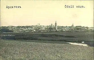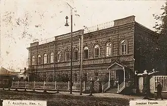 The impetus for the development of Ardatov in the social sphere was the zemstvo reform of 1864. As a result, the town, as well as the rest of Russia, got a local government body, the zemstvo. The chairman of the zemstvo was the Marshal of Nobility, elected for 3 years. The zemstvo assembly consisted in different years of 25 to 35 members, who were in charge of budget and taxation, education and medicine, construction and maintenance of roads and bridges, maintenance of prisons, appointment of officials, magistrates, pensions and scholarships, organisation of agricultural exhibitions, collection and publication of statistics. The assembly met once a year for 5 to 7 days, discussing major issues and then voting on the most important ones. The permanent executive body of the zemstvo was the zemstvo administration.[44] Despite the notable positive contribution of the zemstvo to the town's life, in the last years of its existence the efficiency of this body significantly decreased. Many important projects did not receive due attention, while others were being discussed for years. Funding for most zemstvo organisations was poor. Unlike other rapidly developing Russian towns, Ardatov did not have a strong merchant class, so the key positions in the town were held by nobles. Among them, the Zvenigorod princes' family stood out, whose members occupied almost all key posts.[41] The zemstvo existed in Ardatov for 53 years and was abolished after the October Revolution of 1917. The last chairman of the zemstvo was Prince Ivan Dmitriyevich Zvenigorodsky, great-grandson of the first town governor of Ardatov.[45][46]
