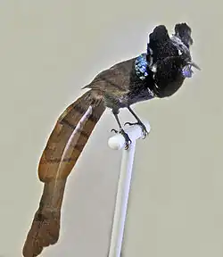 The Arfak astrapia was formally described in 1788 by the German naturalist Johann Friedrich Gmelin in his revised and expanded edition of Carl Linnaeus's Systema Naturae. He placed it with the birds of paradise in the genus Paradisea (now spelled Paradisaea) and coined the binomial name Paradisea nigra.[2] Gmelin based his description on the "Gorget paradise bird" that had been described in 1782 by the English ornithologist John Latham in his book A General Synopsis of Birds. Lathan had examined a specimen in the collection of the naturalist Joseph Banks.[3] The type location is the Arfak Mountains in the Bird's Head Peninsula of northwest New Guinea.[4] The Arfak astrapia is now placed in the genus Astrapia that was introduced in 1816 by the French ornithologist Louis Pierre Vieillot. The genus name is derived from Ancient Greek astrapios or astrapaios meaning "of lightning". The specific epithet nigra is from Latin niger meaning "black".[5] The species is monotypic: no subspecies are recognised.[6]