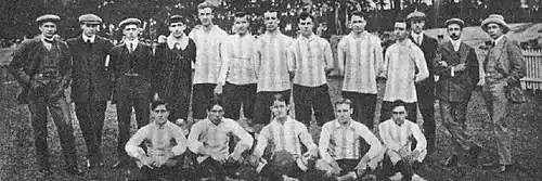 The first kit ever worn by Argentina, in their official debut against Uruguay in 1902, included a light blue shirt.[41][42] On 2 July 1908, Argentina debuted a shirt with light blue vertical stripes on a white jersey, which they used when they played a side formed of Campeonato Paulista players at Velódromo Paulistano;[43] they used the jersey in an official match against Uruguay on 13 September 1908, and the striped jersey has remained as the definitive kit for Argentina ever since then.[35] The team's away kits have been in dark blue shades, with the colours of shorts and socks varying from time to time.[44]