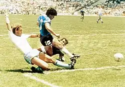 Argentina v England was a football match played on 22 June 1986 between Argentina and England in the quarter-finals of the 1986 FIFA World Cup at the Estadio Azteca in Mexico City. The game was held four years after the Falklands War between Argentina and the United Kingdom, and was a key part in the already intense Argentina–England football rivalry. It was also a match which included two of the most well-known goals in football history, both scored by Argentina captain Diego Maradona.[1][2]