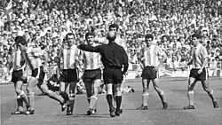 The rivalry between the England and Argentina national football teams is generally traced back to the 1966 FIFA World Cup.[3][4] During the quarter-final game at Wembley Stadium, the home of the England national team, Argentine captain Antonio Rattin was sent off as Argentina lost in a game which contained excessive foul play.[5] Rattin was angered at the sending-off, feeling that the German referee Rudolf Kreitlein, who did not speak Spanish, had been biased towards the English, a fellow European nation, in front of their home fans, and stamped over the royal carpet in the stadium. This led England manager Alf Ramsey to describe the Argentine players as "animals",[6] a comment that caused outrage in Argentina.[4]