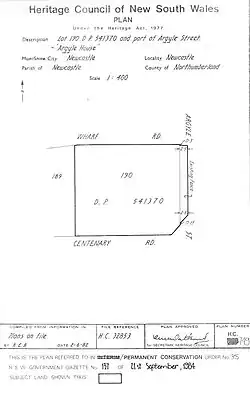 Argyle House is a very good example of an early Victorian cottage (the original 1860s building) that has developed with the addition of many sympathetic buildings in a pavilion style of growth. It is thought to be the oldest surviving structure on this site. It may contain valuable evidence of early building practices and materials. The building has important associations with the Australian Agricultural Company, a principal influence in the early development of Newcastle and the Coal Mining Industry. The only known surviving structure, apart from the pier remnant from the iron bridge, of the early operations of the A.A Coy in the CBD. Argyle House has important associations with the prominent architects Menkens and Castleden.[1]