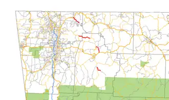 Highway 127 was first designated between 1927 and September 1, 1928, by renumbering State Road 19 between Old Alabam and Forum.[1][2] A second segment of Highway 127 was created from Highway 12 to Beaver Lake on August 25, 1965.[6] The highway was rerouted on June 7, 1995, at the request of the Benton county judge to connect to Highway 12 on both ends, and the former alignment was turned back to county maintenance.[7] The segment of Highway 127 between Garfield and Lost Bridge Village was created on November 23, 1966.[8] The Aurora segment was created on June 28, 1973, pursuant to Act 9 of 1973 by the Arkansas General Assembly.[9] The act directed county judges and legislators to designate up to 12 miles (19 km) of county roads as state highways in each county.[10]