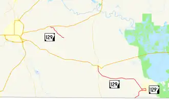 Highway 129 (AR 129, Ark. 129, and Hwy. 129) is a designation for two north–south state highways in Union County. A southern route of 15.02 miles (24.17 km) runs north from Louisiana Highway 33 (LA 33) at the Louisiana state line to US Route 82 (US 82) in Strong.[2] A second route of 4.30 miles (6.92 km) begins at US 63 and runs south to Lawson.[2]
