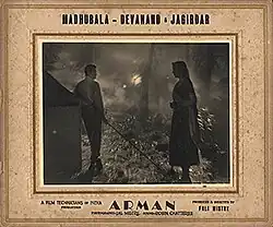 Arman (transl. "Desire") is a 1953 Indian Hindi-language romantic drama film directed and produced by Fali Mistry. The music is composed by S. D. Burman. Arman revolves around Radha (Madhubala), a peasant girl who is fostered by her dead father's loyal servant Ramdas (Jagirdar) so that she does not fall in clutches of her treacherous uncle Bahadur Singh (K. N. Singh). Dev Anand stars as Radha's love interest Madan.