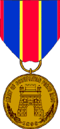 The Army of Puerto Rican Occupation Medal was a service medal of the United States Army which was created by order of the United States War Department on 4 February 1919. A retrospective award created decades after the action commemorated, the medal recognized Army service from 14 August through 10 December 1898 in Puerto Rico. The Army of Puerto Rican Occupation Medal was commemorative by nature although was approved for wear on active military uniforms. A similar medal, the Army of Cuban Occupation Medal was created for occupation service in Cuba following the Spanish–American War. The regulations for the Army of Cuban Occupation Medal were re-written to include regulations for the Army of Puerto Rican Occupation Medal.