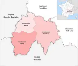 In 1800, the arrondissements of Aurillac, Mauriac, Murat and Saint-Flour were established. The arrondissement of Murat was disbanded in 1926.[2]