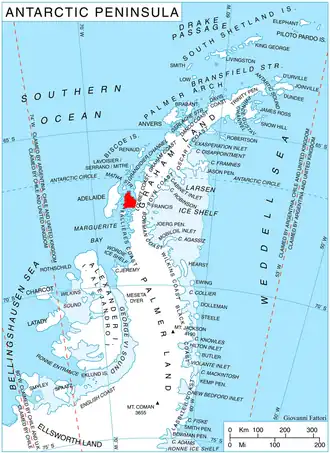 Arrowsmith Peninsula (67°15′S 67°15′W / 67.250°S 67.250°W) is a cape about 40 miles (64 km) long on the west coast of Graham Land, west of Forel Glacier, Sharp Glacier and Lallemand Fjord, and northwest of Bourgeois Fjord, with Hanusse Bay lying to the northwest. It was surveyed by the Falkland Islands Dependencies Survey (FIDS) in 1955-58 and named for Edwin Porter Arrowsmith, Governor of the Falkland Islands.[1]