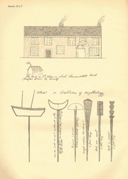 In 1829, ten drawings were obtained by Mr W. E. Cormack during the winter of 1829 from the last known full-blooded Beothuk, Shanawdithit, while she resided in his St. John's house. They present articles of food, utensils, implements and emblems used by the Beothuk, as well as scenes enacted on or near the Exploits River and Beothuk Lake between the years 1810 and 1823. "Although rude and truly Indian in character," James P. Howley wrote in 1915 (judging them by European aesthetic standards), "they nevertheless display no small amount of artistic skill, and there is an extraordinary minuteness of topographical detail in those having reference to the Exploits River and adjacent country. These latter bear a striking resemblance to Micmac sketches of a similar character, such as I have frequently seen and made use of, when accompanied by Micmac canoemen on the Geological Survey of the Island. There is one notable omission in either, i.e., the entire absence of anything like a regular scale. As a rule, rivers and lakes are greatly exaggerated, and particular features, which may in nature be situated widely apart, are frequently crowded into a very small space; the reverse being just as frequently the case."[9]