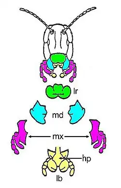 Insect mouthparts exhibit a range of forms.[1] The earliest insects had chewing mouthparts. Specialisation includes mouthparts modified for siphoning, piercing, sucking and sponging. These modifications have evolved a number of times. For example, mosquitoes and aphids both pierce and suck; however, female mosquitoes feed on animal blood whereas aphids feed on plant fluids. This section provides an overview of the individual mouthparts of chewing insects. The diversification of insects' food sources led to the evolution of their mouthparts. This process was facilitated by natural selection.[1]