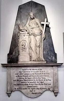 From 1789 till his death he was chaplain to the Spanish embassy in London. He was a wit, and socially acquainted with the circle of Edmund Burke, Richard Brinsley Sheridan, and Charles James Fox, and an honorary member of The Monks of the Screw.[5] In the 1790s he built the original St Patrick's Church, Soho Square for the poor London Irish living around St Giles.[6] He died in London and was buried in Old St Pancras Churchyard. His name is listed on the Burdett-Coutts Memorial to the eminent graves lost from the graveyard.