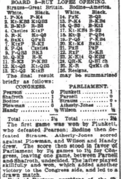 Strauss also enjoyed playing chess and was a member of a House of Commons International Chess Team which played against a team of players from the United States House of Representatives. The team played chess games by transmitting moves through a transatlantic cable. In one match against the United States House of Representatives, Strauss lost his match against Bodine, but the teams drew with 2½ points each.[13]