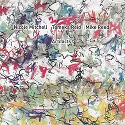 Artifacts is an album by a collective trio consisting of Nicole Mitchell on flute and electronics, Tomeka Reid on cello and Mike Reed on drums, which was recorded in 2015 and released on 482 Music. The trio, conceived by Tomeka Reid for a concert in Seattle early in 2015, was formed to celebrate the legacy of the Association for the Advancement of Creative Musicians during its 50th anniversary, interpreting compositions by some of its members.[1] Cover art by Lewis Achenbach, created live during the 50th anniversary of the AACM at Mandel Hall in Chicago.