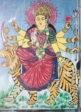 On the boulder of Ravanachhaya at Sitabhinji Group of Rock Shelters in Keonjhar district is a mural belonging to later Gupta period and shows resemblance to those of the Ajanta style.[2] From the period of 1600 to present murals were painted in the numerous templates of Odisha depicting sacred figures such as the painting of Buddha Vijaya in the Jagamohana of Lakshmi Temple and inside the Jagannath Temple at Puri, the Biranchinarayana Temple, in Buguda, Ganjam district and so on.[2]