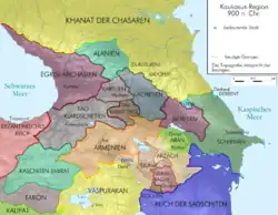 In the 7th–9th centuries, the South Caucasus was dominated by the Arab Caliphates. In the early 9th century two Armenian princes, Sahl Smbatian and Esayi Abu-Muse, revolted against Arab rule and established two independent principalities in Artsakh: Khachen and Dizak. At the time the Byzantine emperor Constantine VII addressed letters "to prince of Khachen – to Armenia", being the residence of the Armenian prince Sahl Smbatian. In 852–855 Sahl Smbatian and Esayi Abu-Muse fought against the Abbasid commander Bugha.[65] The latter 28 times unsuccessfully attempted to conquer Ktich Castle (situated near modern-day Togh in Nagorno-Karabakh), the main stronghold of the Armenians of Artsakh. The descendants of Sahl Smbatian through his son Atrnerseh consolidated their rule over Artsakh over the years; Artsakh was politically unified for three-and-a-half centuries until Hasan the Great partitioned it between two of his sons in 1182.[23] From c. 1000 to 1266 the rulers of Khachen styled themselves "Kings of Albania" or "Kings of Artsakh", but they stopped using the royal title after the death of Hasan Jalal Dawla in the 1260s.[23] The principality eventually split into smaller parts known as the Khamsa Melikdoms of Karabakh, ruled by branches of the House of Hasan-Jalalyan. Subsequently, Artsakh existed as a vassal of the Kara Koyunlu, Ak Koyunlu, Iranian Safavids, Zands, Afsharids, and Qajars, until it was ceded to Imperial Russia following the outcome of the Russo-Persian War (1804-1813) and the following Treaty of Gulistan.[2]