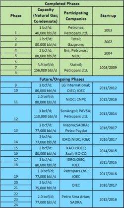 - Phases 12 development begin carried out by Petropars as a LNG project. This phase will produce 2.5 billion cubic feet (71,000,000 m3) per day of rich natural gas, 75 million cu ft (2.1 million m3) per day of ethane, 80,000 barrels (13,000 m3) per day of condensate, 3000 tons of LPG per day plus 400 tons of sulfur per day. Venezuela's state-owned oil company Petroleos de Venezuela S.A. (PDVSA) will finance 10 percent of the 7.8-billion-dollar project. Angola's Sonangol Group has also been awarded a 20 percent stake in phase 12 project.[18]