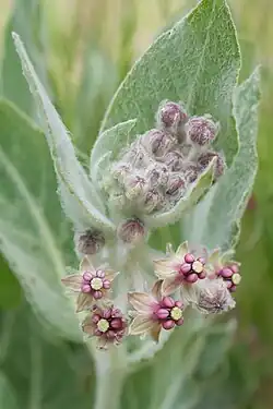 Asclepias californica is native to California and northern Baja California. It is a flowering perennial with thick, white, woolly stems which bend or run along the ground. The plentiful, hanging flowers are rounded structures with reflexed corollas and starlike arrays of bulbous anthers.
