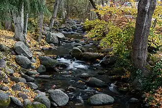 Below the reservoir, the main stem continues north through a canyon, then through a channel confined by urban development and into the broad alluvial valley of Bear Creek. The stream gradient averages about 9 percent on the upper reaches and 3 percent within the city.[3]