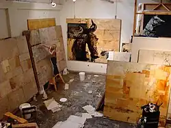 Ashley Collins is an American Contemporary Painter. Collins' massive scaled paintings are found in blue chip collections and museums worldwide.[1] Her painful and lengthy journey from homelessness and abject poverty to acclaimed painter informs meaning into each of her deeply layered works.[2] Collins is known in part for taking exhibitions to a new level, such as floating 8’x10’ works off of 50’ cranes and using fire, water and other elements as part of her exhibitions.[3] Her journey from rags to riches has been one of the most successful, in American Art, and her international recognition has soared.[4] Although painting professionally since 1988, Collins first came to blue chip collector attention in the early 2000s for her massive scaled contemporary works integrating portions of figurative horseheads amongst layers of collage, historical documents, steel, metal, and other mediums which Collins integrated into her monumental works;[5] breaking price points for living female contemporary painters.[6] “Collins has gone from being homeless and sleeping on concrete floors in pursuit of Artistic Success – and she has surely achieved it, her mega scale paintings including horse imagery [sic] command eye watering prices.”[7] Robert Rauschenberg, upon seeing her works, quoted "through her eyes and vision I have seen the pain, the confidence and sturgggle of my own journey and perhaps that is what in art touches us all".[8]