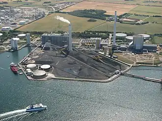 The Asnæs Power Station (Danish: Asnæsværket) is a woodchip power plant operated by Ørsted A/S in Kalundborg, Denmark. It consists of three active units, which deliver 147 MW (Unit 2), 270 MW (Unit 4) and 640 MW (Unit 5). Unit 3 went in service in 1959 and uses a 152.1-metre-tall (499 ft) flue gas stack, while Unit 5, which went into service in 1981, uses a 220.1-metre-tall (722 ft) flue gas stack, the third tallest in Denmark. Its two 60m high coal cranes were dismantled in 2016.[1]