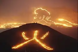 The Daihimonjiyaki (大火文字焼き) is part of the Noyaki (のやき, burning of the hills) that occurs in Aso, at the beginning of March every year. The hills are burnt to stop the growth of trees allowing the grass to take over, thereby maintaining Aso's famous grasslands.[17] The kanji (Chinese character) for fire Hi (火)、and the character for flame Hono (炎) is lit onto Ojo-dake and Motozuka (known locally as Kitazuka) which are two hills, on the second Saturday of March every year.[18] The symbol can be seen from the top of the caldera to the surrounding villages. Fireworks and market stalls are also planned as part of the overall festival.