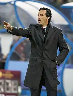 Aston Villa appointed former Liverpool and England captain Steven Gerrard as head coach on 11 November 2021.[79] After a poor start to the 2022–23 season, in which Villa won just twice and scored only seven goals in their opening 11 games, Gerrard was sacked in October 2022,[80] and replaced by four-time Europa League-winning Spanish manager Unai Emery.[81] He led Villa to 7th place and qualification for the Europa Conference League in his first season.[82] In the 2023–24 season, Emery led the club to the Conference League semi-finals,[83] where they were knocked out by Olympiacos, and a 4th-place finish in the league, securing participation in the UEFA Champions League for the first time since 1982–83.[84]