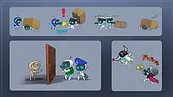 Each of the four worlds are split up into four levels that are interconnected with each other. Two of these levels involve regular platforming whereas the other two involve a special power-up suit which makes use of the DualSense controller's capabilities. For example, one world features a frog suit with a spring at the bottom in which the controller must be tilted laterally to guide the frog and the trigger pressed down to compress the spring, which offers resistance similar to how a real spring would using the adaptive trigger system. Another example is the ball suit in which the player must swipe the touchpad to guide the ball. The worlds also contain large numbers of other robots performing various activities, including acting out scenes from various current and former PlayStation-exclusive game franchises, such as God of War and Resident Evil.[9] In the worlds, there are cable wires that Astro Bot can pull to collect projectiles, coins, and artifacts, including other robots, with some on enemy robots. If Astro Bot falls or gets defeated, the level will restart from the latest checkpoint cleared.