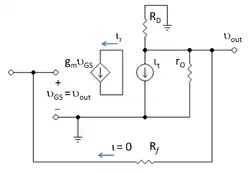 6. ^ Because the input voltage vGS approaches zero as the return ratio gets larger, the amplifier input impedance also tends to zero, which means in turn (because of current division) that the amplifier works best if the input signal is a current. If a Norton source is used, rather than an ideal current source, the formal equations derived for T will be the same as for a Thévenin voltage source. Note that in the case of input current, G is a transresistance gain.