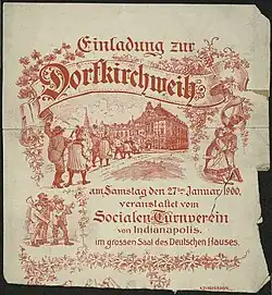 For a cost of $32,000, two lots were purchased at the corner of Michigan and New Jersey streets. A German neighborhood called Lockerbie Square, also known as Germantown, surrounded the clubhouse. Construction of the East Wing began in May 1893, and was finished in 1894. The West Wing construction started in 1897 and was completed in 1898.[3] German American architects Bernard Vonnegut Sr. (grandfather of Indianapolis novelist Kurt Vonnegut) and Arthur Bohn designed both wings.[4] It was called Das Deutsche Haus and hosted many organizations, including the German-American Veterans Society, the German-American School Society, the Socialer Turnverein Women's Club, the German Ladies' Aid Society, and the Turner Building and Savings Association.[5] There were 500 members by 1896.[5][6]