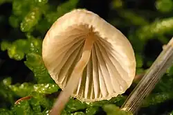 The gills are ascending and somewhat hooked or toothed, narrow at first but becoming rather broad (2.5 mm and becoming 3–4 mm). They are nearly equal in width throughout or slightly ventricose in age, with a spacing that is close to subdistant. About 18–24 gills reach the stem, with two tiers of lamellulae (short gills that do not extend fully from the cap margin to the stem) that may develop veins running between them. The gills are white to creamy-white with edges that are even and whitish, and waxy in appearance and consistency. The stem is 3–8 cm (1.2–3.1 in) long, 1–2.5 mm (0.04–0.10 in) thick, equal, tubular, somewhat elastic, cartilaginous, and not particularly fragile. The base of the stem is either strigose (covered with sharp, straight, stiff white hairs) or surrounded with a matted white mycelium. Above the base, the stem is smooth, and pruinose toward the apex. When moist it is translucent with slight ripples running transversely, and white to pale yellow.[9]