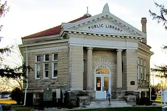 The Atlanta Public Library, located at the intersection of Race and Arch Streets in Atlanta, Illinois, was built in 1908 and has operated continuously as a library since. Architect Paul A. Moratz's design combines the Neoclassical with an octagonal plan, an uncommon mixture of styles. The building's eight sides are all symmetrical except for the front, which is broken by a classical portico with Doric columns and a round arched entrance. The library is topped by a red tile roof.[2]