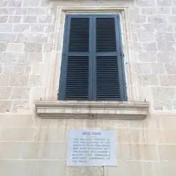 Auberge d'Aragon was designed by the Maltese architect Girolamo Cassar in 1566, making it the oldest auberge in the city of Valletta. The plot of land on which it was built was purchased on 20 September 1569 for the sum of 80 scudi and 8 tari.[4] Construction began in 1571.[5] In 1674, the Langue of Aragon built the Church of Our Lady of Pilar adjacent to the auberge. The 1693 Sicily earthquake caused serious damage to the façade and the southeast face of the auberge, but the damage was later repaired.[4] The church was also damaged, and it was rebuilt in a new design, being completed in 1718.[6]