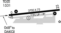 - Runway 7/25: 3,700 x 75 ft (1,128 x 23 m) plus 240 ft (73 m) overruns at each end, surface: asphalt