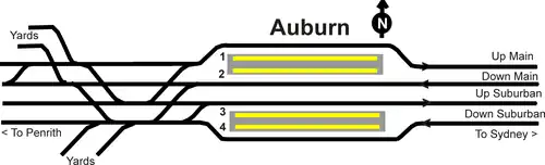 Auburn station opened in 1877.[3] The station was rebuilt in 1913 and again in 1954 when the line was quadrupled.[4]