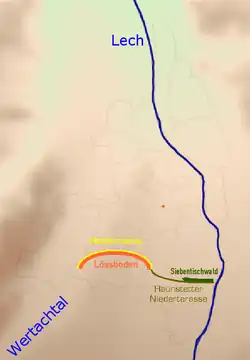 Haunstetten is the southernmost subdivision of Augsburg and lies between the rivers Lech, Wertach and Singold, on a river terrace. The Planungsraum comprises five Stadtbezirke, (English: Ward, singular: Stadtbezirk) the 12th, 33rd, 34th, 35th, and 36th Stadtbezirke, which are named Siebenbrunn, Haunstetten-Nord (North), Haunstetten-Süd (South), Haunstetten-Ost (East) and Haunstetten-West, respectively. Haunstetten borders five other Planungsräume even though its entire eastern and southern borders are the municipal boundaries of Augsburg. Haunstetten borders Inningen to the west, Universitätsviertel to the northwest, Spickel-Herrenbach and Hochzoll to the north. Haunstetten also shares an extremely short border with Hochfeld along its northwestern edge. Haunstetten is bordered to the east by the Haunstetten Forest, which runs along the entire eastern border of the Planungsraum. The lowland geography of Haunstetten has allowed for the development of extensive heathlands.