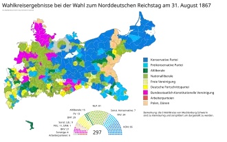 Elections to the Reichstag of the North German Confederation were held on 31 August 1867,[1] with run-off elections during the following weeks. The National Liberal Party continued to serve as the largest party, winning 81 seats. These were the first regular and last elections during the North German Confederation. In July 1870 the Reichstag members decided not to hold new elections during the Franco-Prussian war, in spite of the three-year period.