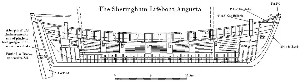 The new lifeboat was built by a local builder, Robert Sunman. It was made from timbers grown in the nearby Sherringham Park and the boat was built in the style of the local herring fishing boats. The Augusta was 33 feet 6 inches[3] long and 10-foot 3 inches[3] wide. The power for the boat was provide by 16 oars.[2] She was equipped with a dipping lug mainsail, mizzen sail and had fittings for a rudder at either end to avoid turning her in heavy seas.[3]