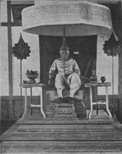 Pavie went on to become consul in 1886 and consul general in 1891.[6] In 1887, Luang Prabang was sacked by Chinese and T'ai bandits, hoping to liberate the sons of their leader Đèo Văn Trị, held prisoner by the Siamese; Pavie prevented the capture of the ailing local ruler Oun Kham by ferrying him away from the burning city to safety in Bangkok, Siam, thereby winning his gratitude and building his trust in French colonial plans, which were to be one of Pavie's major preoccupations from 1888 onwards.[2] Pavie subsequently established friendly relations with Deo Van Tri, negotiating the release of his brothers; as a result a protectorate treaty was signed with the French in 1889 making Deo Van Tri Lord of Lai Châu, the main town in the Sip Song Chau Tai alliance located in the Black River region of Tonkin that he controlled.[8] Pavie referred to this kind of diplomacy as la conquête des coeurs [the winning of hearts], which became the title of his autobiography.