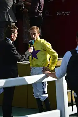 Aurélien Lemaitre (born 3 July 1989[2][1]) is a French flat racing jockey. He joined the horse racing school AFASEC in Gouvieux near Chantilly aged 14, inspired by his father who had horses as his hobby.[3] Lemaitre apprenticed for trainer Freddy Head[3] and made his debut in June 2005, aged 16, and won his first race year later in July 2006.[2] He has since achieved over 700 wins, including more than 35 on the Group level, winning his first Group race in Group 3 Prix du Palais-Royal in 2015. He was Freddy Head's stable jockey until Head's retirement from training at the end of 2022, after which he switched to being a stable jockey for his son Christopher Head. Lemaitre spent several winters in the United States as a work rider for Julio Canani and Bill Mott.[4]