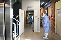 The COVID Austral Solidarity Hospital operated during 2020 and was created exclusively to care for serious COVID-19 patients referred by the public health system.[30] It was promoted with the help of foundations and private companies,[31][32] such as Techint Group, Bayres Bau Werke construction company,[33] foundations such as Sura, Pérez Companc, Phillips, Itaú Bank, Los Pibes, Bunge y Born,[34] Cámara Industrial de Laboratorios Farmacéuticos Argentinos (CILFA), Southworks, Sullair, entre otros.[35] It was inaugurated by Argentinian President Alberto Fernández.[36] During 6 months, 197 patients were hospitalized, which meant 2,940 critical unit bed-days, with more than 300 people actively working at the Solidarity Hospital.[37]