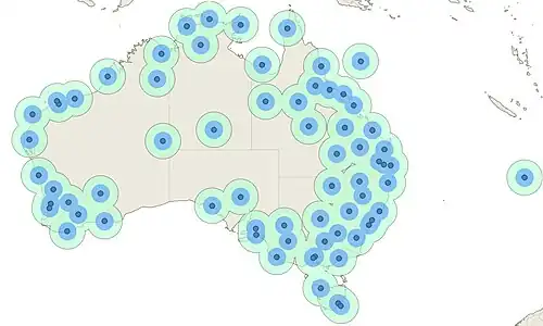 ![]() Radar sites of the BoM network, and indicative radar coverage in 2025. Inner radius (100 km) indicates generally reliable coverage. Outer radius (200 km) indicates general limit of potentially useful coverage. Beyond 200km, coverage is generally unreliable due to earth curvature but may occasionally be useful in larger weather systems such as tropical cyclones. Note: Does not show coverage degradation from obstructions. | |