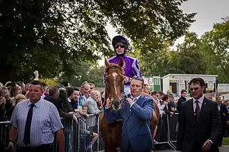 In October 2012, the yearling was sent to the Tattersalls sales where he was bought for 525,000 guineas by the bloodstock agent Dermot "Demi" O'Byrne acting on behalf of John Magnier's Coolmore organisation.[5] For racing purposes, Australia ran in the ownership of a partnership consisting of Susan Magnier, Derrick Smith, Michael Tabor and the Malaysian architect and entrepreneur Teo Ah Khing of Desert Star Holdings.[6] Jockey Joseph O'Brien rode Australia in all the races of his career and wore the purple silks of Derrick Smith on all those occasions.
