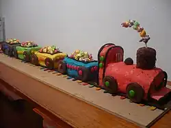The cover illustration is of the "train cake", for which it became synonymous — the cookbook is sometimes referred to as "the book with the train on the cover".[6] The swimming pool cake — a construction filled with jelly and tiny swimming figures — has been referred to as "the crowning glory", because, to a parent, it seemed so difficult to engineer.[5] Some of the better-known cakes are:[7][8]