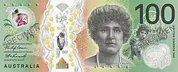 - The $100 note features world-renowned soprano Dame Nellie Melba (1861–1931), and the distinguished soldier, engineer and administrator General Sir John Monash (1865–1931).[39]